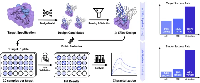 这使得 Chai-2 能够跨多种模式(例如 scFv 抗体、纳米抗体 (VHH) 和微型蛋白等,设计新的蛋白质结合剂。