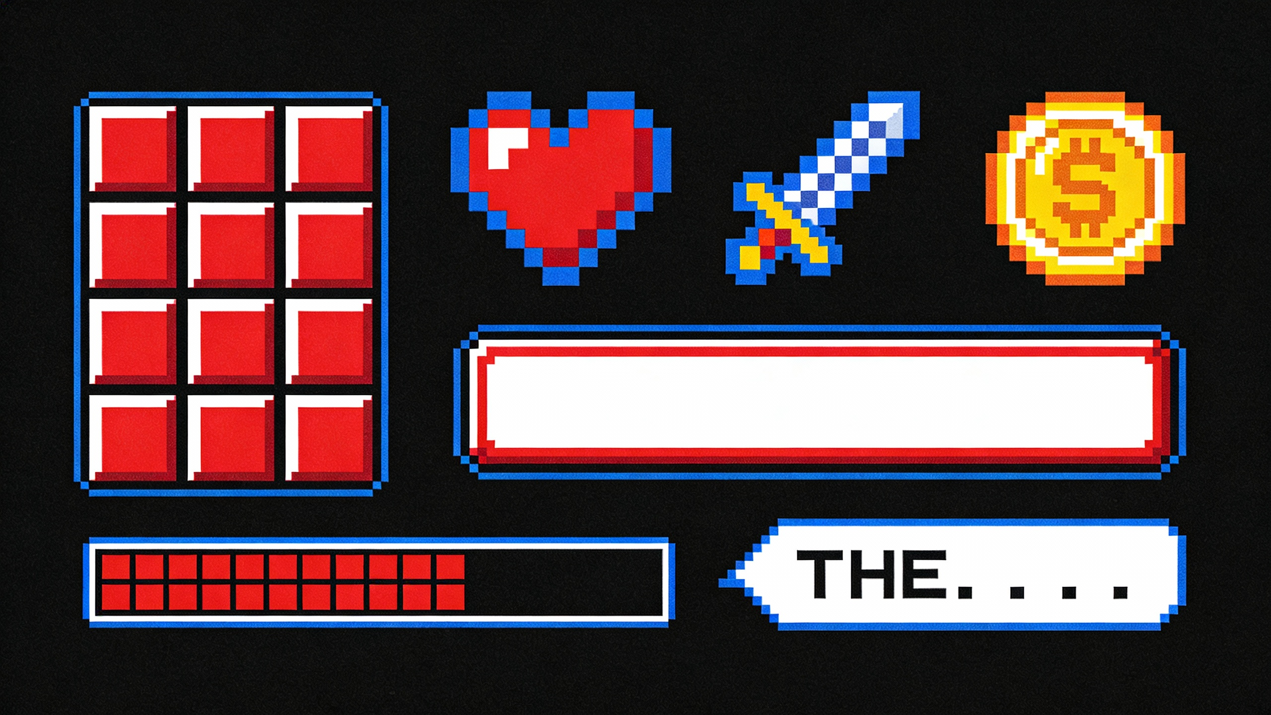 复古像素艺术风游戏UI组件套装,以纯黑为背景,融合街机游戏元素、16-bit电子颗粒感(鲜艳的红蓝配色、方块化设计)。包含界面元素:像素格子物品栏、功能图标(像素红心、像素宝剑、金币)、粗边框矩形按钮、格子血条、文字对话框。风格怀旧经典,充满红白机时代的电子美学,适用于独立像素动作游戏的界面设计,边缘清晰无模糊。