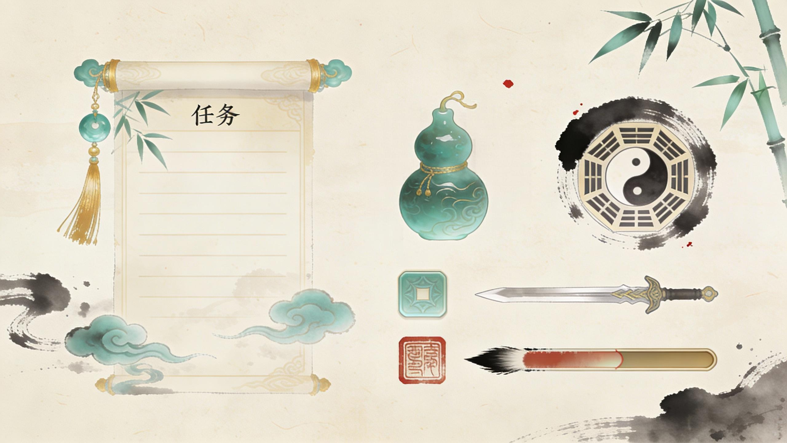 东方国风修仙游戏UI组件套装,以米色宣纸纹理为背景,融合水墨笔触、青玉装饰元素(云纹、竹叶、金色流苏)。包含界面元素:卷轴式任务面板、功能图标(丹药葫芦、八卦镜、飞剑)、印章风格按钮、毛笔笔触进度条、墨色与朱砂配色方案。风格古朴典雅,充满仙气与道家美学,适用于武侠RPG游戏的界面设计,具有细腻的纸张纹理与水墨晕染效果。