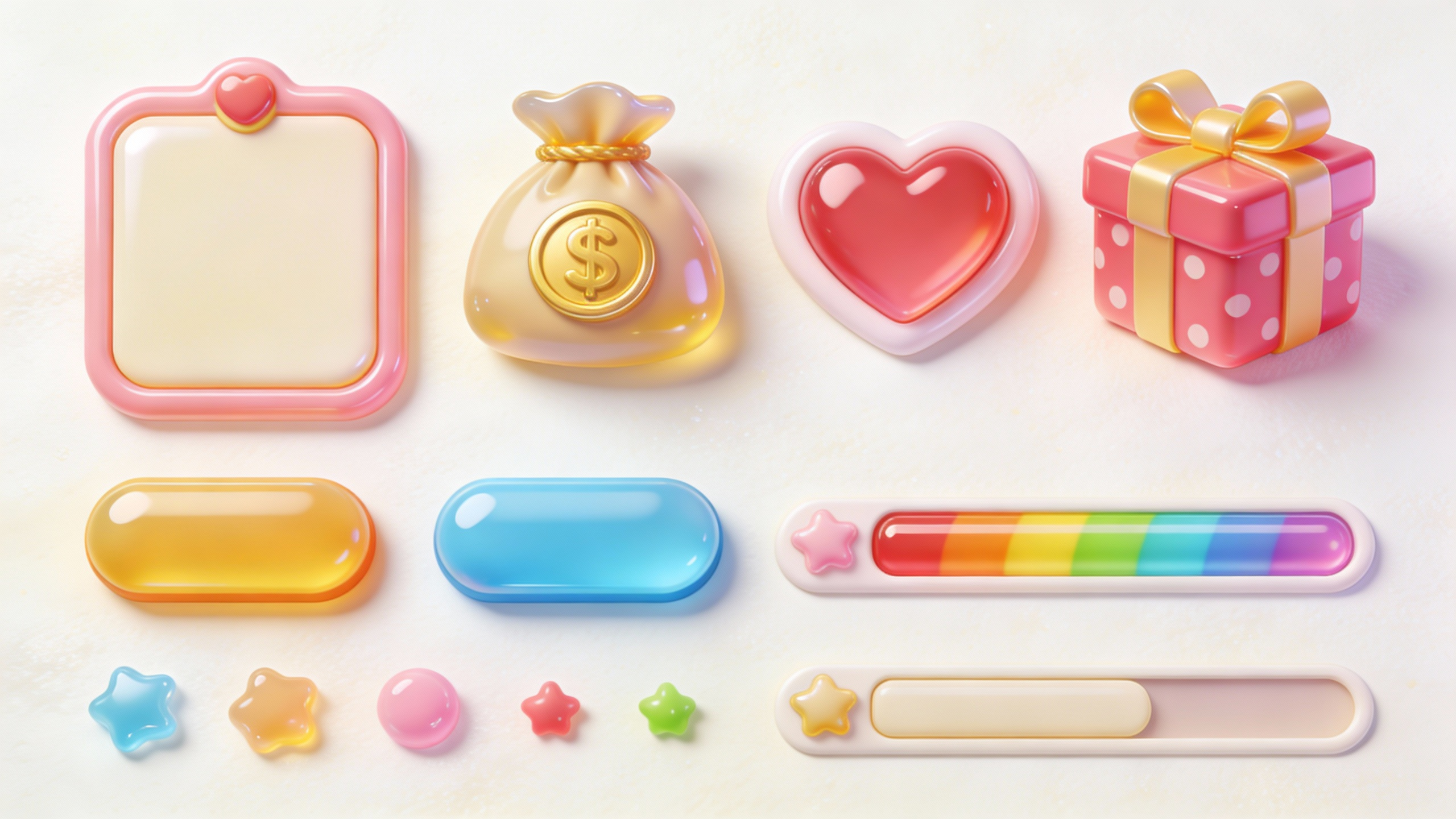 Q版3D休闲游戏UI组件套装,以明亮的奶油白为背景,融合果冻材质、软糖质感元素(圆润导角、高饱和度糖果色)。包含界面元素:圆润可爱的弹窗面板、功能图标(金币袋、爱心体力、卡通礼物盒)、凸起的3D按钮、彩虹色进度条、活泼的各种小装饰。风格轻松愉快,充满童趣与亲和力,适用于模拟经营或消除类手游的界面设计,具有Blender渲染般的树脂光泽感。