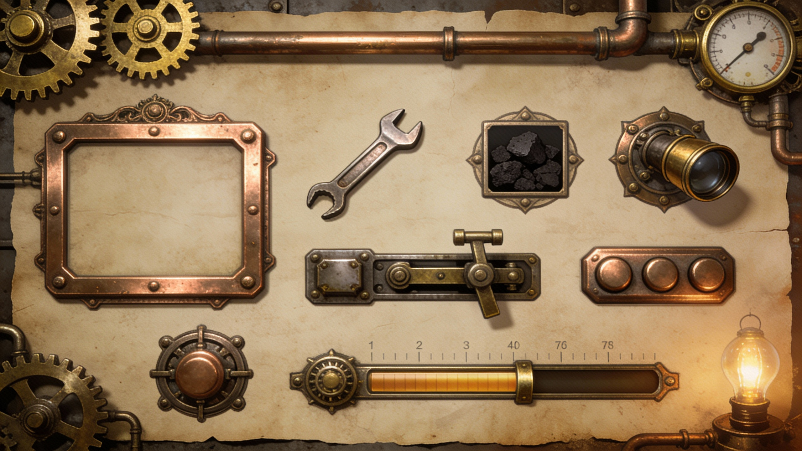 维多利亚蒸汽朋克风游戏UI组件套装,以做旧牛皮纸为背景,融合黄铜齿轮、蒸汽管道元素(精密机械结构、压力表盘装饰)。包含界面元素:铜质边框的建造面板、功能图标(扳手、煤炭、望远镜)、机械杠杆式按钮、蒸汽压力进度条、复古灯泡点缀。风格精密硬朗,充满工业革命时期的机械美学,适用于生存建造类游戏的界面设计,金属质感强烈。