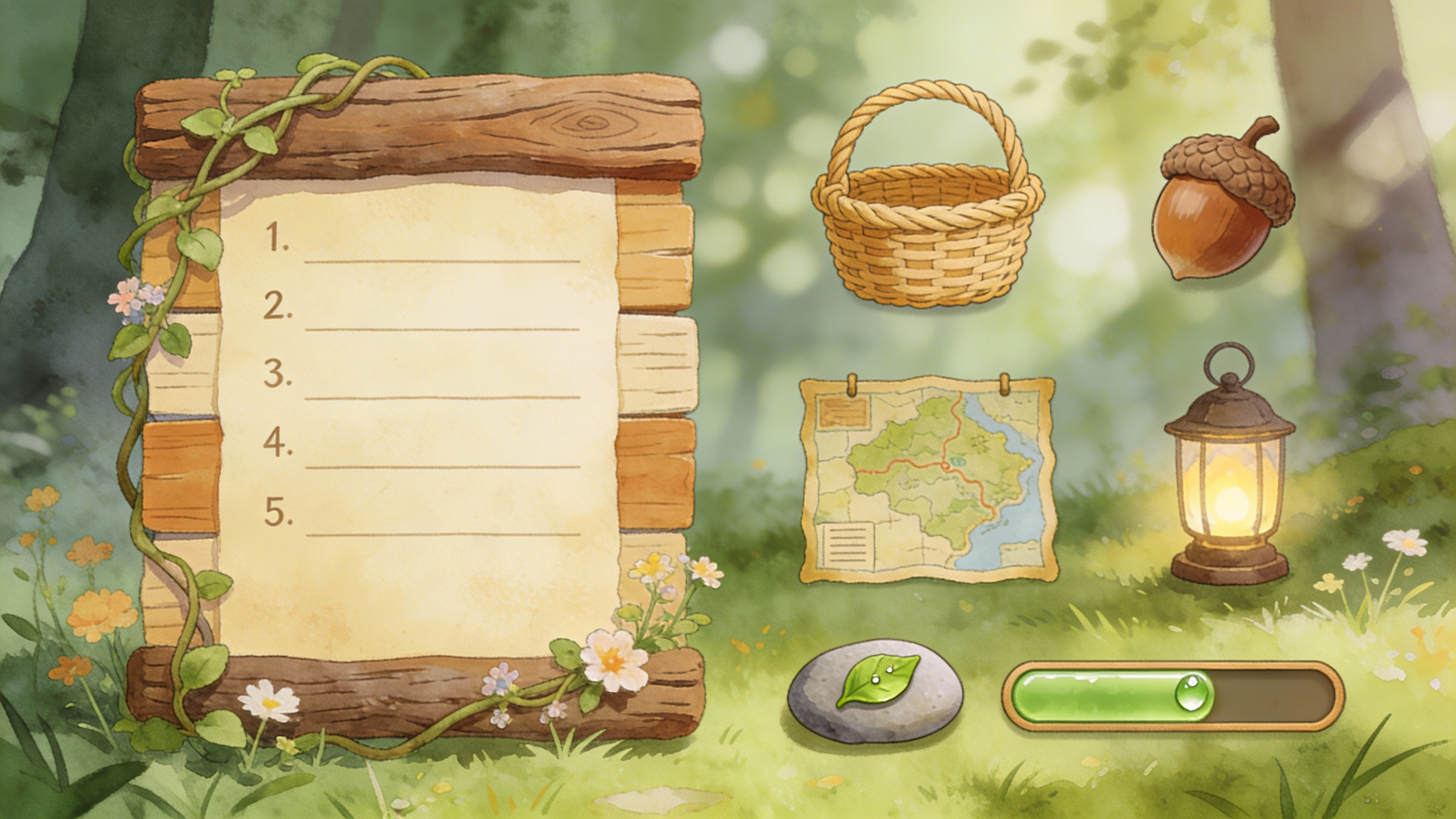 治愈系森系童话风游戏UI组件套装,以柔和的森林草地或模糊的树影为背景,融合手绘水彩质感、天然木材元素(原木纹理、缠绕的藤蔓、野花点缀)。包含界面元素:木板拼接的任务面板、功能图标(编织篮、橡实、探险地图、提灯)、圆润的鹅卵石风格按钮、绿叶露珠进度条、温暖的森系配色。风格清新自然,充满生活气息与手作感,适用于田园模拟经营或治愈冒险游戏的界面设计,具有绘本插画般的细腻笔触。