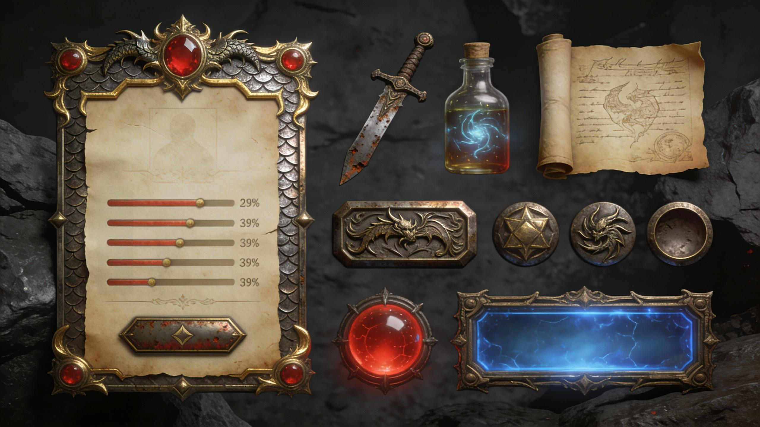 史诗魔幻风游戏UI组件套装,以深岩灰为背景,融合古铜金属、龙鳞纹理(金色镶边、红宝石点缀)。包含界面元素:羊皮纸质感的人物属性面板、功能图标(生锈的剑、魔法药水、古老卷轴)、浮雕风格按钮、红色生命球与蓝色魔法槽、复古边框。风格厚重华丽,充满岁月痕迹与史诗战斗感,适用于硬核ARPG游戏的界面设计,具有电影级的高清质感与细腻的光影渲染。