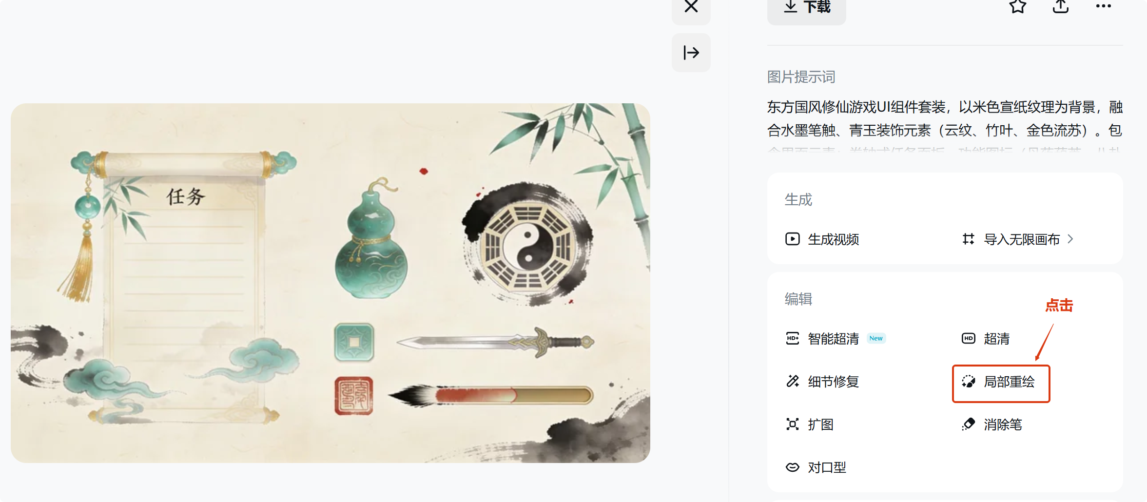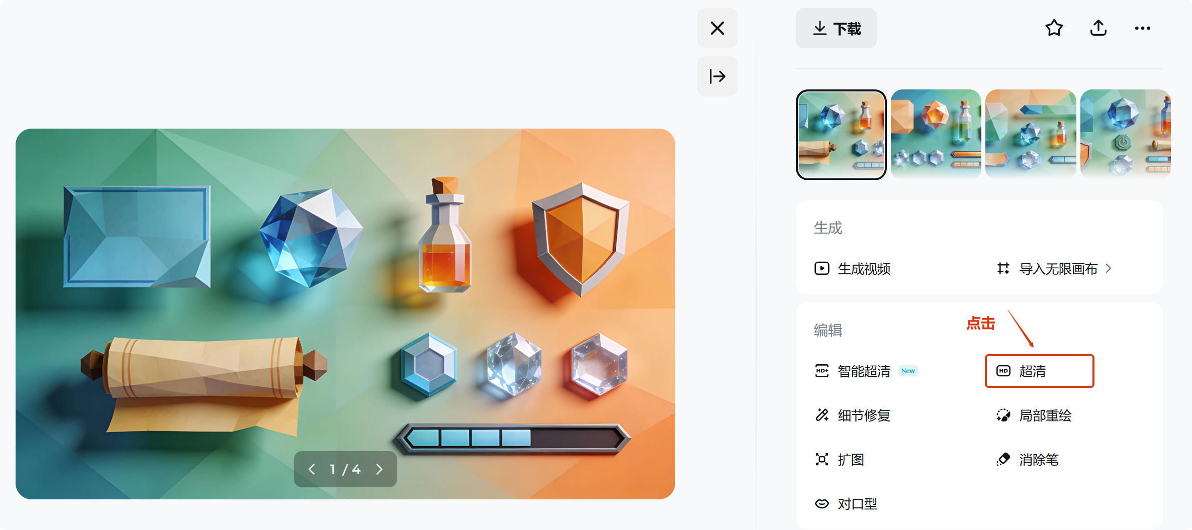 待生成满意的图片后,点击图片下方的“超清”按钮,确保存入Unity或Unreal Engine时,素材边缘锐利,细节抗打。