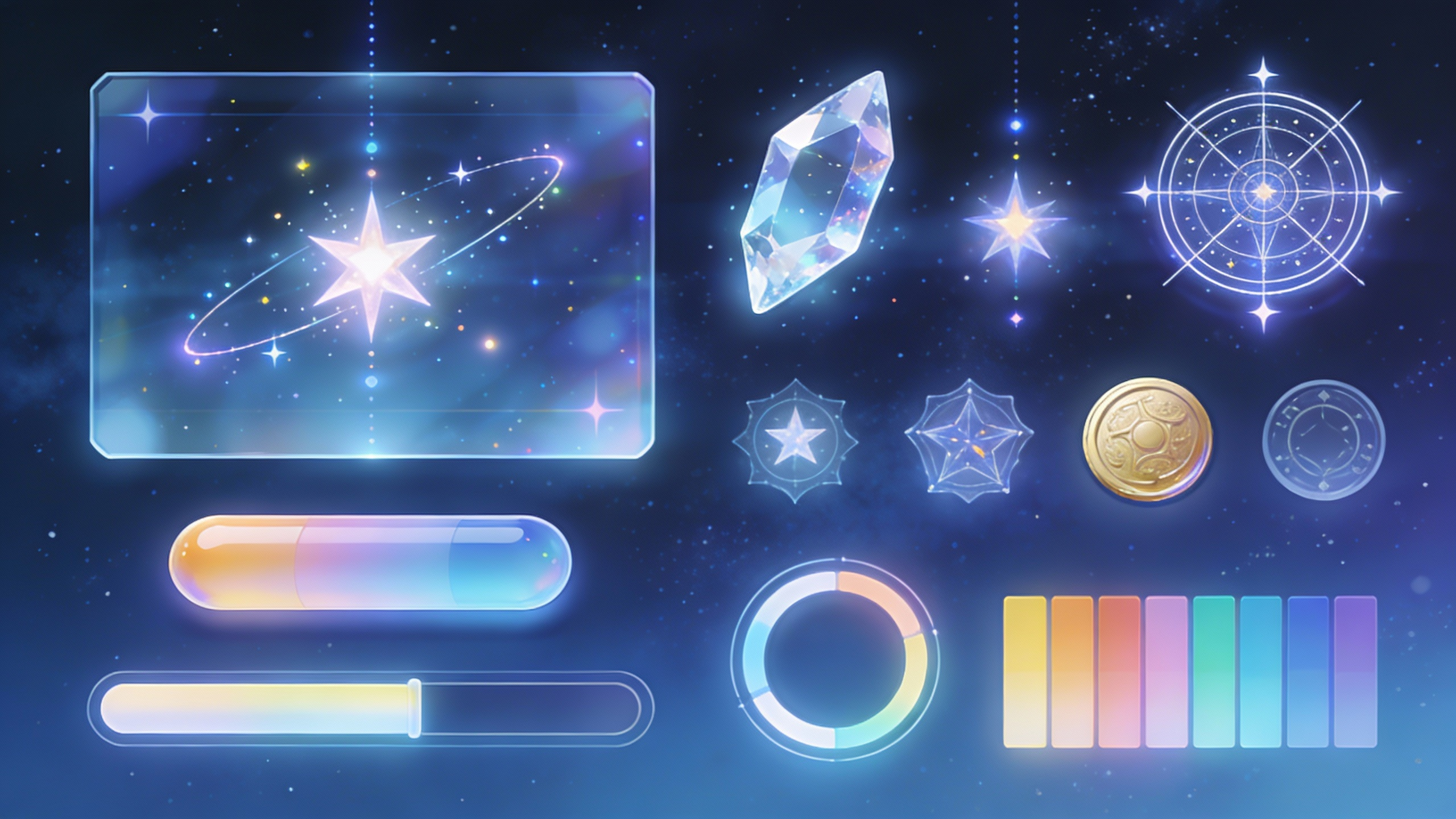 二次元幻想科技风UI组件套装,以半透明深蓝星空为背景,融合流光玻璃、悬浮粒子元素(星形全息投影、发光线条)。包含界面元素:磨砂玻璃质感的系统菜单面板、功能图标(水晶碎片、星图罗盘、祈愿币)、胶囊型渐变按钮、环形进度条、明亮的色彩色板。风格精致梦幻,兼具未来感与魔法感,适用于二次元开放世界游戏的HUD界面,画面干净,高分辨率。