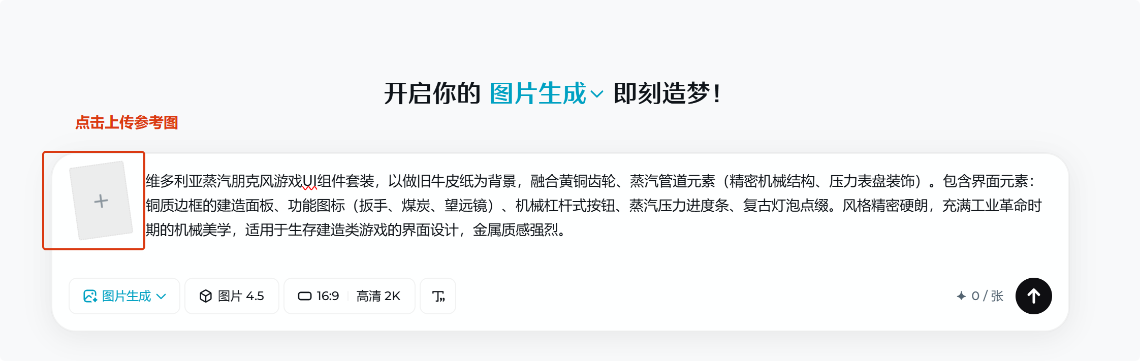 如果你有大概的草图,或者策划给的参考图,可以上传“参考图”,既能保留你的构图逻辑,又能让AI帮你细化质感。