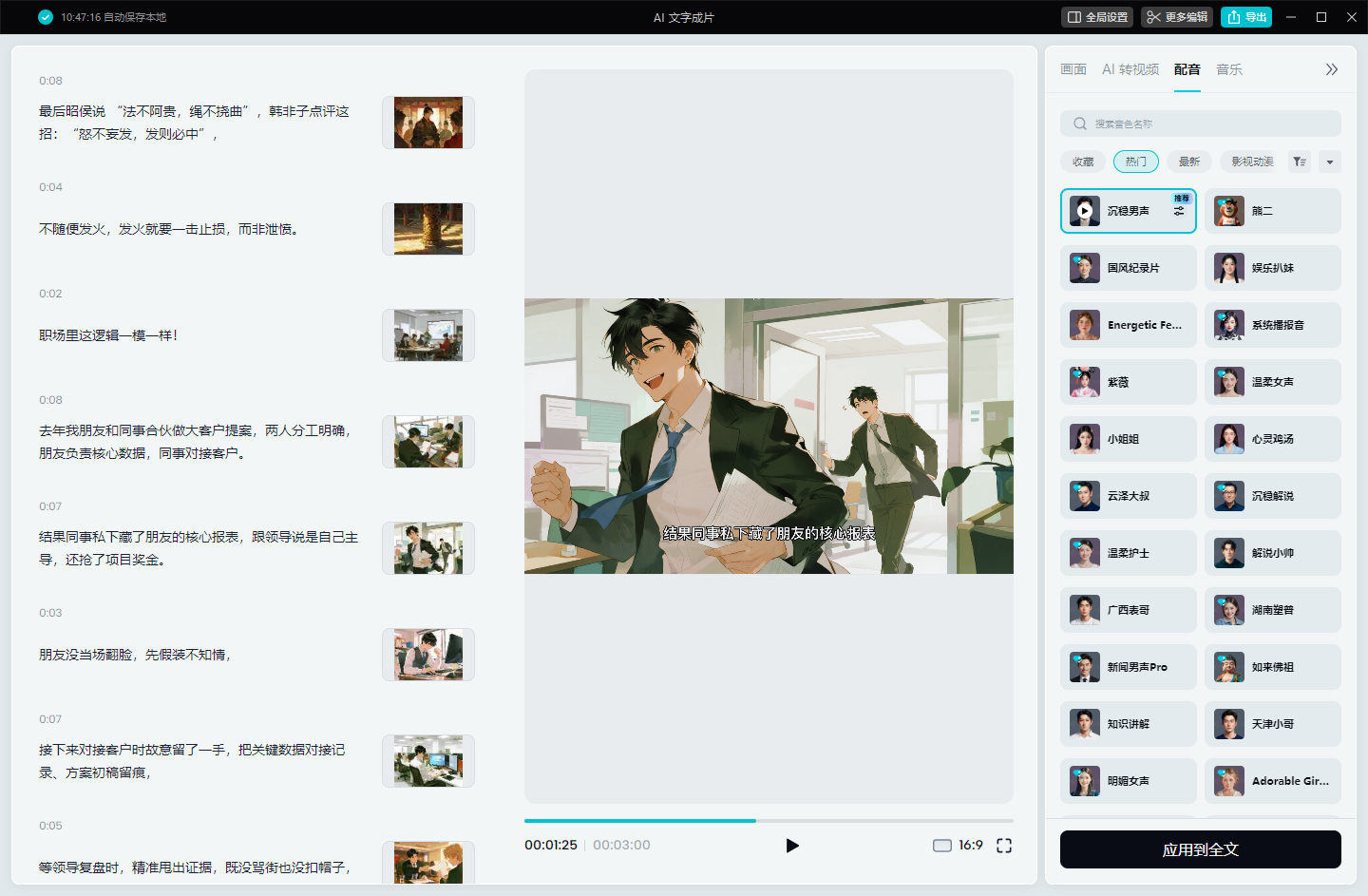 3、等待1分钟左右,整个故事视频就生成好了,如果对配音不满意,可以点击右侧的配音编辑面板,选择你喜欢的音色,重新配音即可