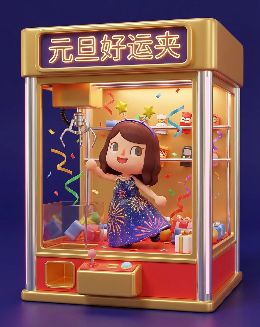 输入「将快乐烟火精灵以动森风格呈现,制作成一个3D粘土风格的卡通角色。她穿着闪耀礼服裙,有星星发箍,站在一个烟火庆典风格的抓娃娃机内。机器配色为金红+亮银,顶部写着‘元旦好运夹’,内部布满飞舞彩带。整体风格为喜庆,画风可爱、童趣且富有节日惊喜特色。」AI即可输出一个精灵站在金红抓娃娃机里的可爱图像,完美用于店内海报。