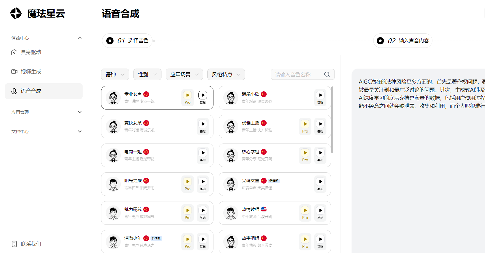 - 体验中心:可以体验具身驱动、视频生成、语音生成等功能;