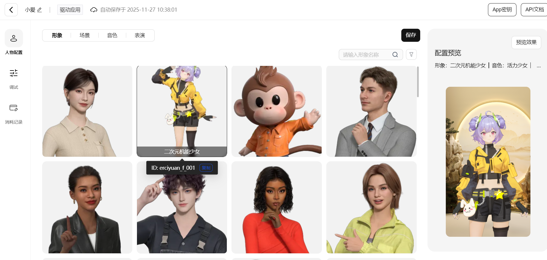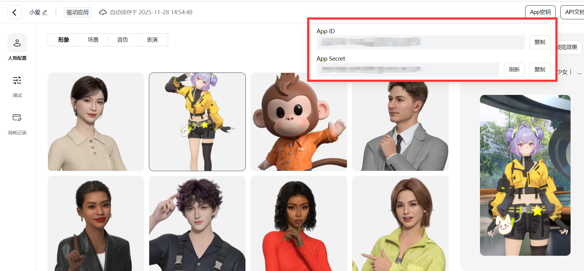 - 应用管理*:选择/定制数字人形象(超写实、二次元、卡通等风格);