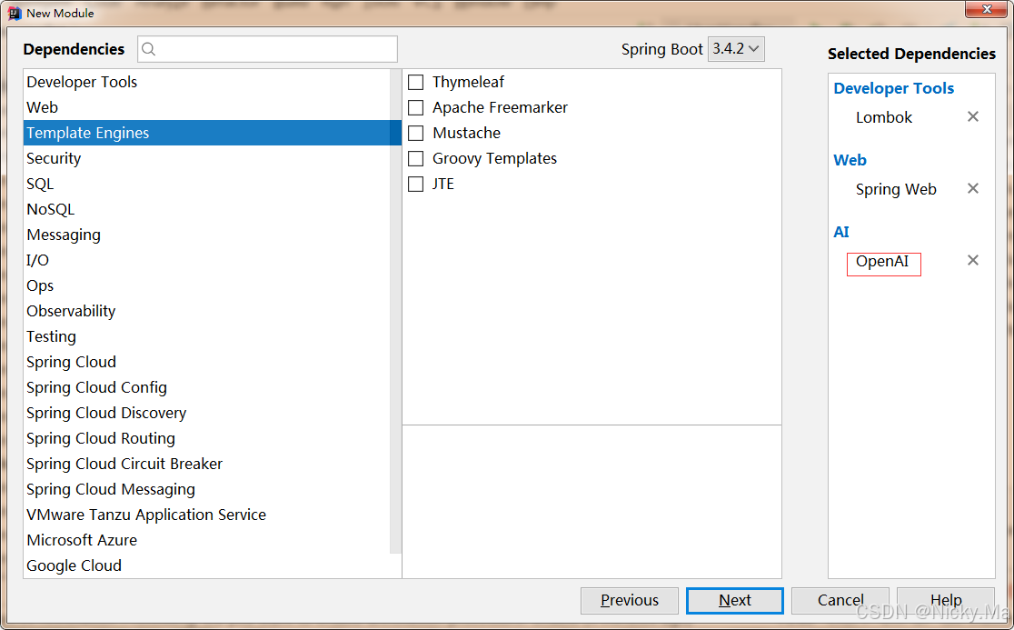 JDK 要求 : 最低要求 :JDK 17。 推荐版本 :JDK 17 或更高版本。 Spring Boot 要求 : 支持的版本范围 :Spring Boot 3.2.x 和 3.3.x。 最低版本 :Spring Boot 3.2。 二、创建项目 使用 Spring Initializr 创建项目 访问 Spring Initializr : https://start.spring.io/ 选择项目配置 : Project :Maven Language :Java Spring Boot Version :3.2.0 Dependencies : Spring Web Spring AI OpenAI Starter Lombok Spring Boot DevTools(可选,用于开发时的热部署) 生成项目 :点击“Generate”按钮下载项目压缩包,并解压到本地。 也可以在idea里调用,然后生成项目