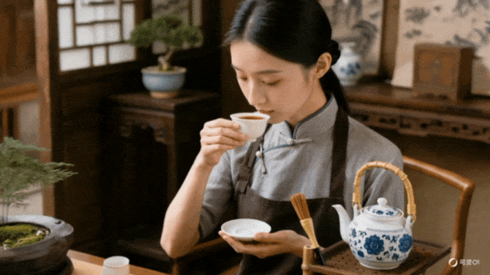 05 | 白瓷品茗杯盛放红亮茶汤,茶艺师手持杯柄轻举杯,杯沿靠近唇边,背景虚化呈现中式茶室角落,柔和暖光,缓慢推近,近景,8K分辨率,写实摄影质感,16:9比例 | A white porcelain tea cup filled with bright red tea soup, a tea artist holding the cup handle and gently raising the cup, the edge of the cup approaching the lips, the background blurred to show the corner of a Chinese-style tea room, soft warm light, slow push-in, medium close-up, 8K resolution, photorealistic texture, 16:9 aspect ratio |
