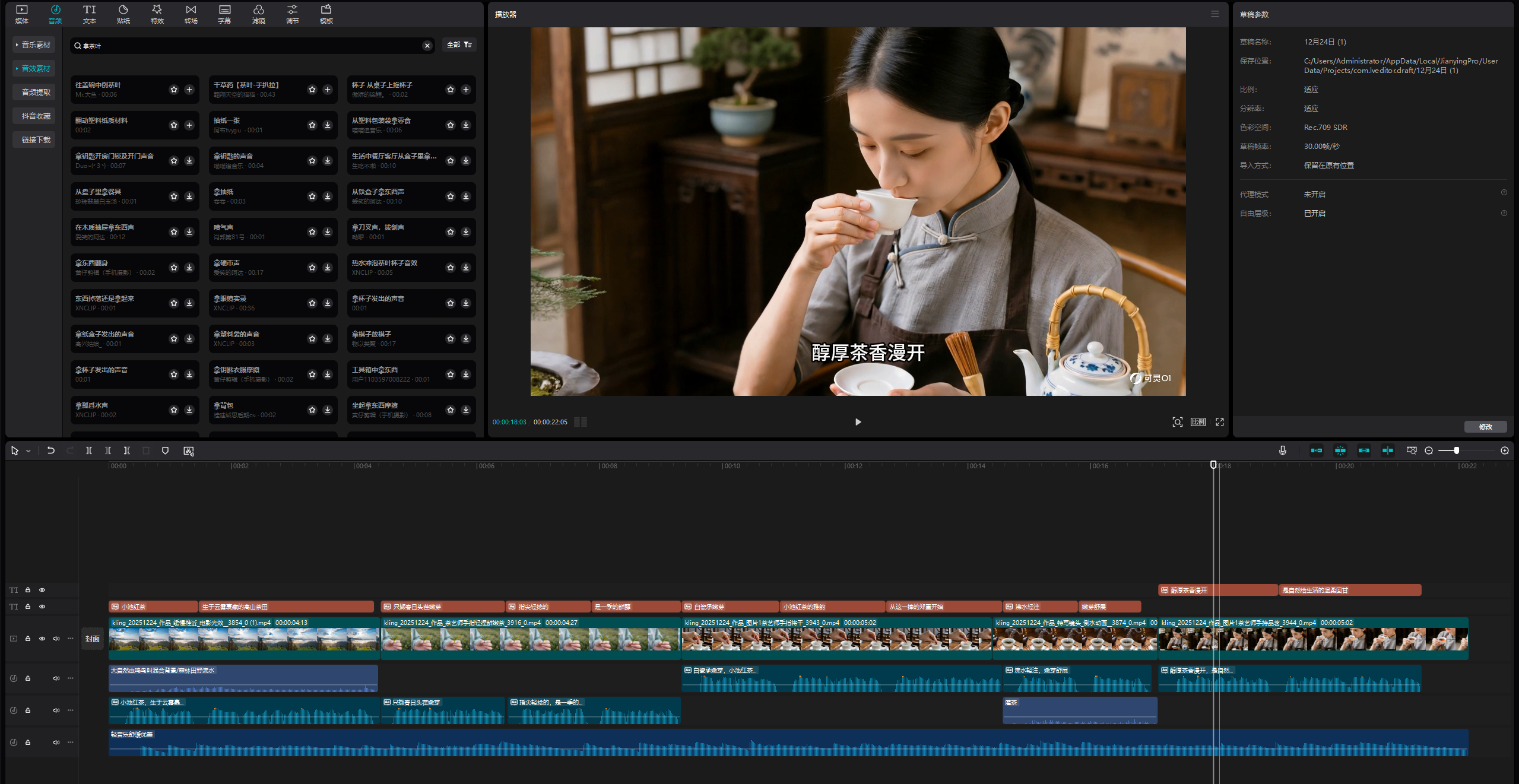 - 环境音:添加「倒水声」「瓷器碰撞声」「鸟鸣声」(对应镜头插入,增强代入感);