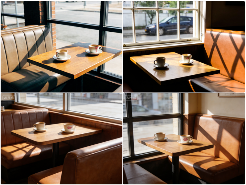 场景 | A cozy cafe booth by a large window. **Wooden table, two coffee cups, one with a lipstick mark, afternoon sun casting long shadows on the seat.** Empty, waiting for occupants. Cinematic, wide shot, depth of field.(靠在大窗户旁的一个温馨咖啡馆卡座。木质桌子,两个咖啡杯,其中一个带有口红印,午后的阳光在座位上投下长长的影子。空荡荡的,等待着主人。电影感十足,广角镜头,有景深效果。) |