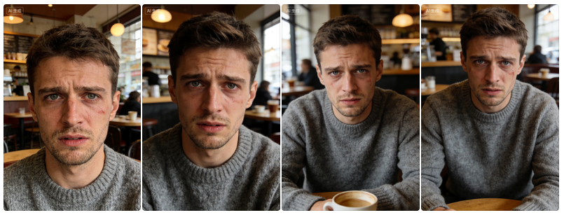 男主 | A photo of a man named Leo, **Caucasian, short brown hair, clean shaven, wearing a grey wool sweater**, looking directly at the camera with a complex, pained expression, in a cafe. Cinematic, portrait photography, sharp focus on eyes, 85mm lens.(一张名为莱奥的男子的照片,白人,短棕色头发,干净的下巴,穿着灰色羊毛毛衣,直视相机,表情复杂且痛苦,在咖啡馆里。电影风格,肖像摄影,眼睛部分清晰对焦,使用85mm镜头。) |