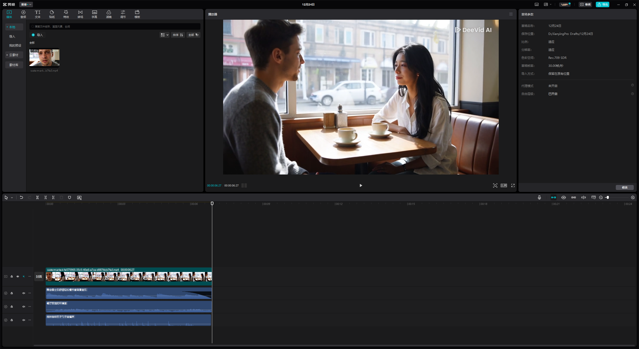 生成前想要的画面没有出现,那就需要借助到剪辑工具来做视频融合了,直接将视频导入到剪映,把前面突兀的那段直接剪掉,融合咖啡馆的背景音、用户交谈声、汤匙敲击声等音效,这部短片就成了。