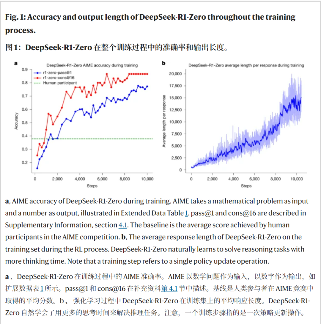 DeepSeek-R1-Zero 在整个训练过程中的准确率和输出长度。