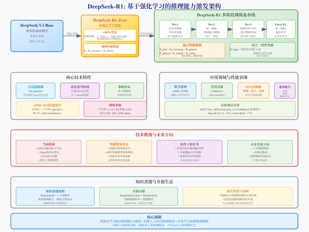 这个多阶段设计的巧妙之处在于:既保留了纯RL带来的推理突破,又通过工程化手段解决了实用性问题。