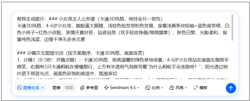 2、复制上面给出的全部分镜提示词,粘贴到对话框,点击生成即可