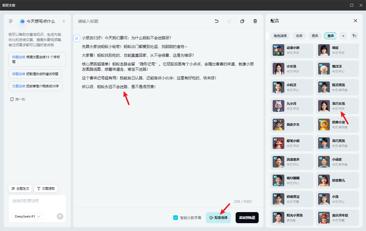 2、加配音:点击【音频】→【文本】→【添加口播稿】,选 “儿童音” 或 “亲切宝妈音”,把 豆包给的脚本文案粘贴进去,生成后对齐视频画面