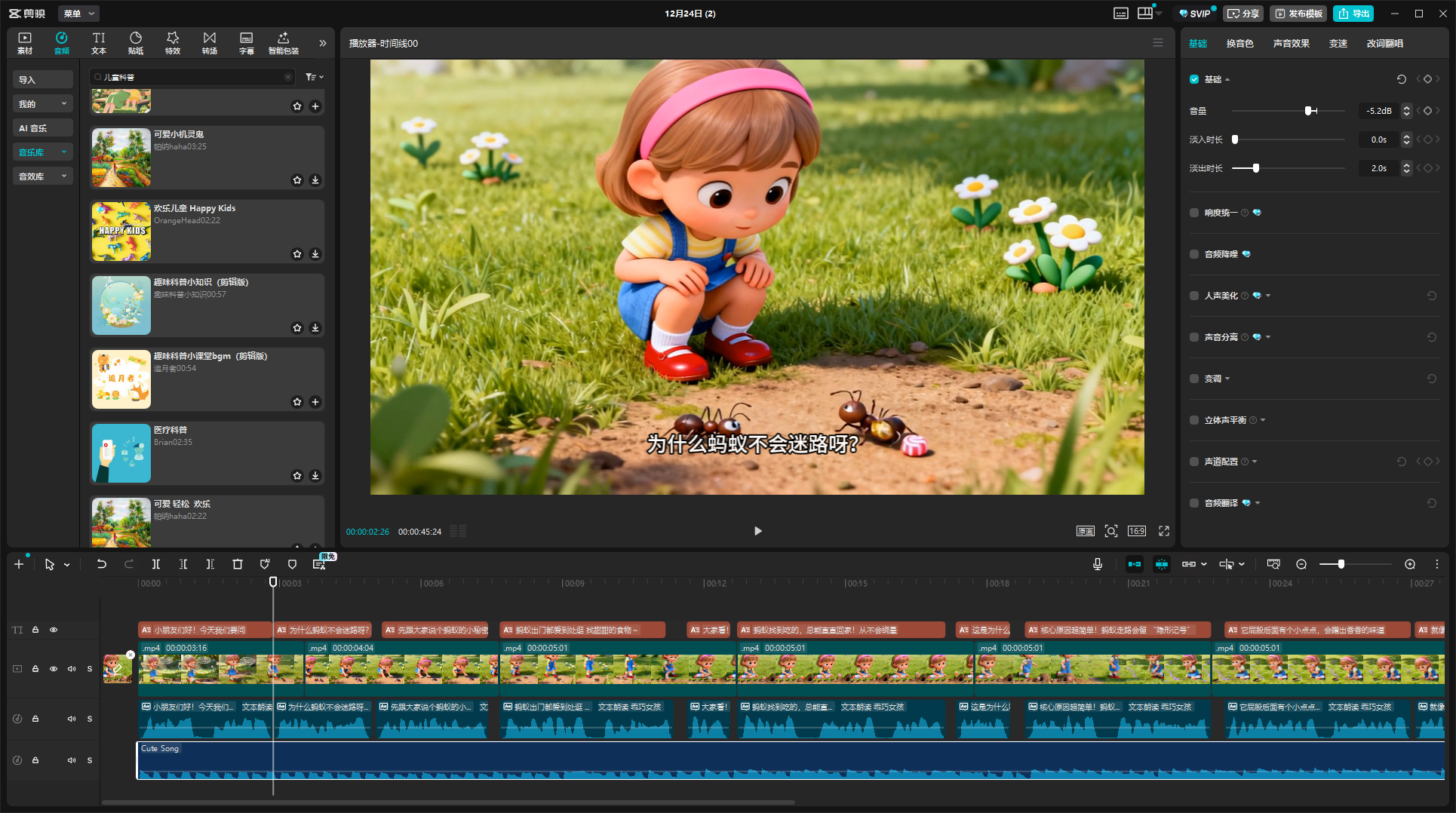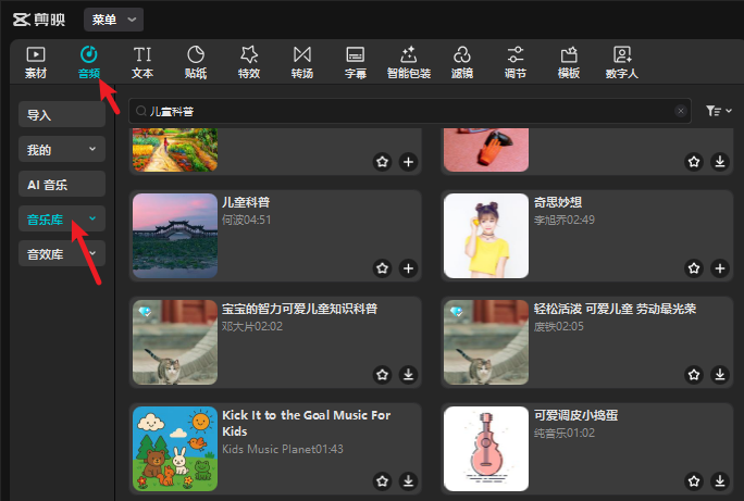 3、加 BGM 和音效:搜 “儿童纯音乐”“儿童科普”,选无歌词的,音量调小(不盖过配音);再给动态画面