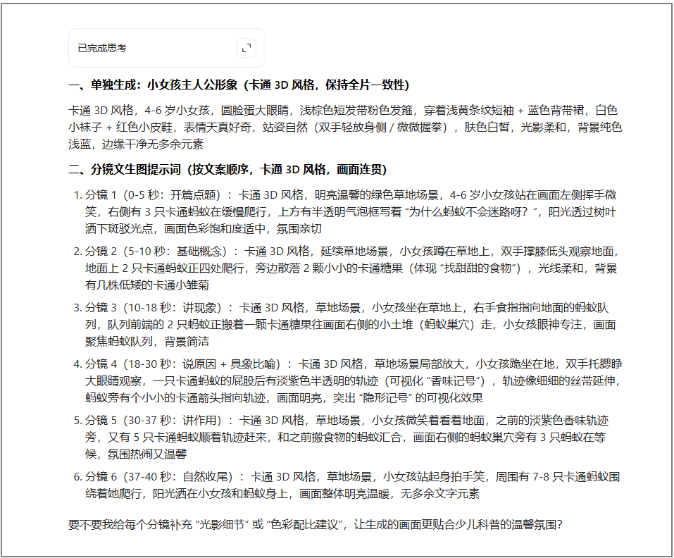 这步是核心偷懒技巧!不用自己想科普知识点,不用费脑写分镜,给豆包一个指令,直接出全套方案~