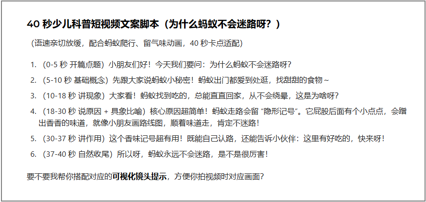 (37-40 秒 自然收尾)所以呀,蚂蚁永远不会迷路,是不是很厉害!