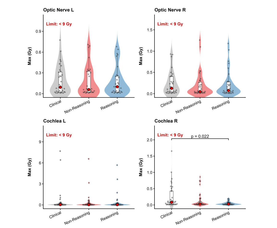 正是这种 假设-验证-修正 的系统2思维,让它在保护右侧耳蜗这项指标上,做到了显著优于人类物理师(p=0.022)。人类物理师可能因为疲劳或习惯忽略了极致的优化空间,但“慢思考”的AI不会。