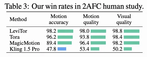 - 人类研究:如下表3所示,在与SOTA方法(Tora、MagicMotion、LeviTor、Kling 1.5 Pro)进行的双向强制选择(2AFC)人类评估中,Wan-Move在运动准确性、运动质量和视觉质量方面均表现出卓越的胜率,尤其是与商业模型Kling 1.5 Pro相比,Wan-Move在运动质量方面具有竞争性优势。