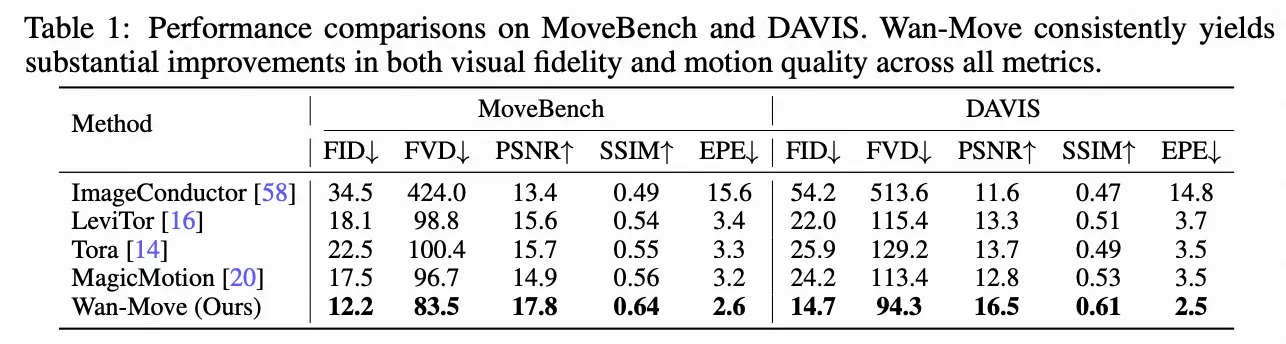 - 实验设置:Wan-Move基于最先进的图像到视频生成模型Wan-I2V-14B实现,并在一个包含200万个高质量视频的数据集上进行微调。评估指标包括FID、FVD、PSNR、SSIM用于衡量视频质量,以及EPE用于评估运动精度。所有评估均在480p分辨率下进行。