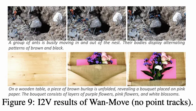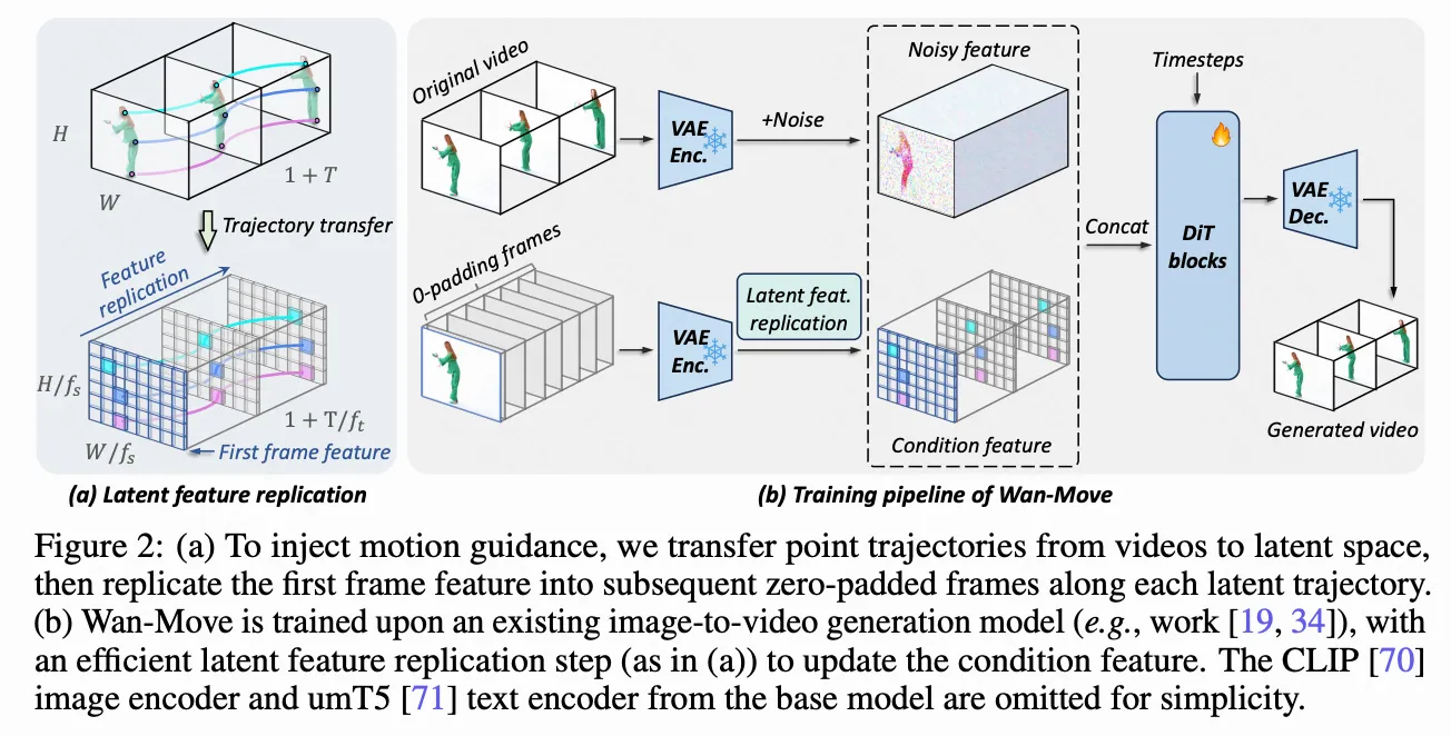 - Wan-Move,一个用于图像到视频生成中运动控制的框架。与需要运动编码的现有方法不同,它通过编辑条件特征注入运动引导,无需添加新模块,从而易于大规模微调基础模型。