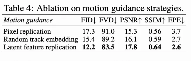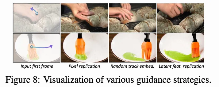 - 轨迹引导策略:如下表4和下图8所示,本文比较了像素复制、随机轨迹嵌入和隐空间特征复制三种策略。结果表明,本文提出的隐空间特征复制方法在视频质量和运动控制精度方面均优于其他方法,这归因于其能够捕获丰富的局部上下文信息。