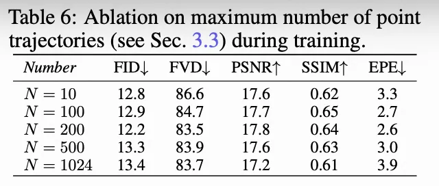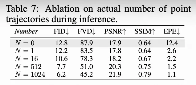 - 推理期间点轨迹数量:如下表7所示,推理时增加点轨迹数量会显著降低EPE,提高运动引导和时间连贯性。即使模型在最多200个轨迹下训练,也能在多达1024个轨迹下表现出强大的泛化能力。此外,无点轨迹的I2V推理(如下图9所示)的PSNR和SSIM与运动控制生成相当,表明模型保留了固有的I2V质量。