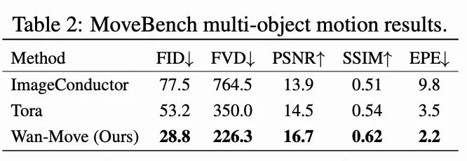 - 单物体运动控制:如下表1所示,Wan-Move在MoveBench和DAVIS数据集上均显著优于ImageConductor、LeviTor、Tora和MagicMotion等方法,在视频质量(最高PSNR和SSIM)和运动控制精度(最低EPE)方面表现最佳。