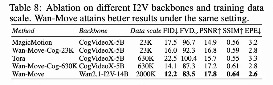 - 骨干网络和数据规模:如下表8所示,在相同骨干网络和数据规模下,Wan-Move即使与MagicMotion和Tora等方法相比,仍能取得更好的结果,这验证了本文方法的优越性。