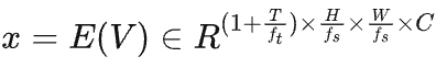 编码器E压缩时间和空间维度,压缩比分别为ft(时间)和fs(空间),同时将通道维度扩展到C,得到