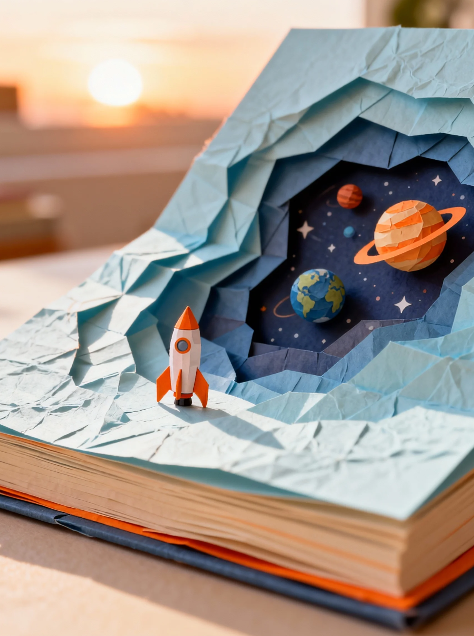 “一幅以[太空探险]为主题的3D立体书插画,层叠的纸质元素缓缓展开成一个微缩宇宙场景,小型火箭和星球层层叠加。柔和的晨光洒落,纹理丰富的纸张表面模拟手工折叠的趣味质感,温暖的[浅蓝]和[暖橙]色调营造梦幻氛围,从略微倾斜的45度角观看,突出多层次的深度感和精细细节,高分辨率适合儿童图书印刷,无尖锐边缘,确保安全温暖的阅读体验。”