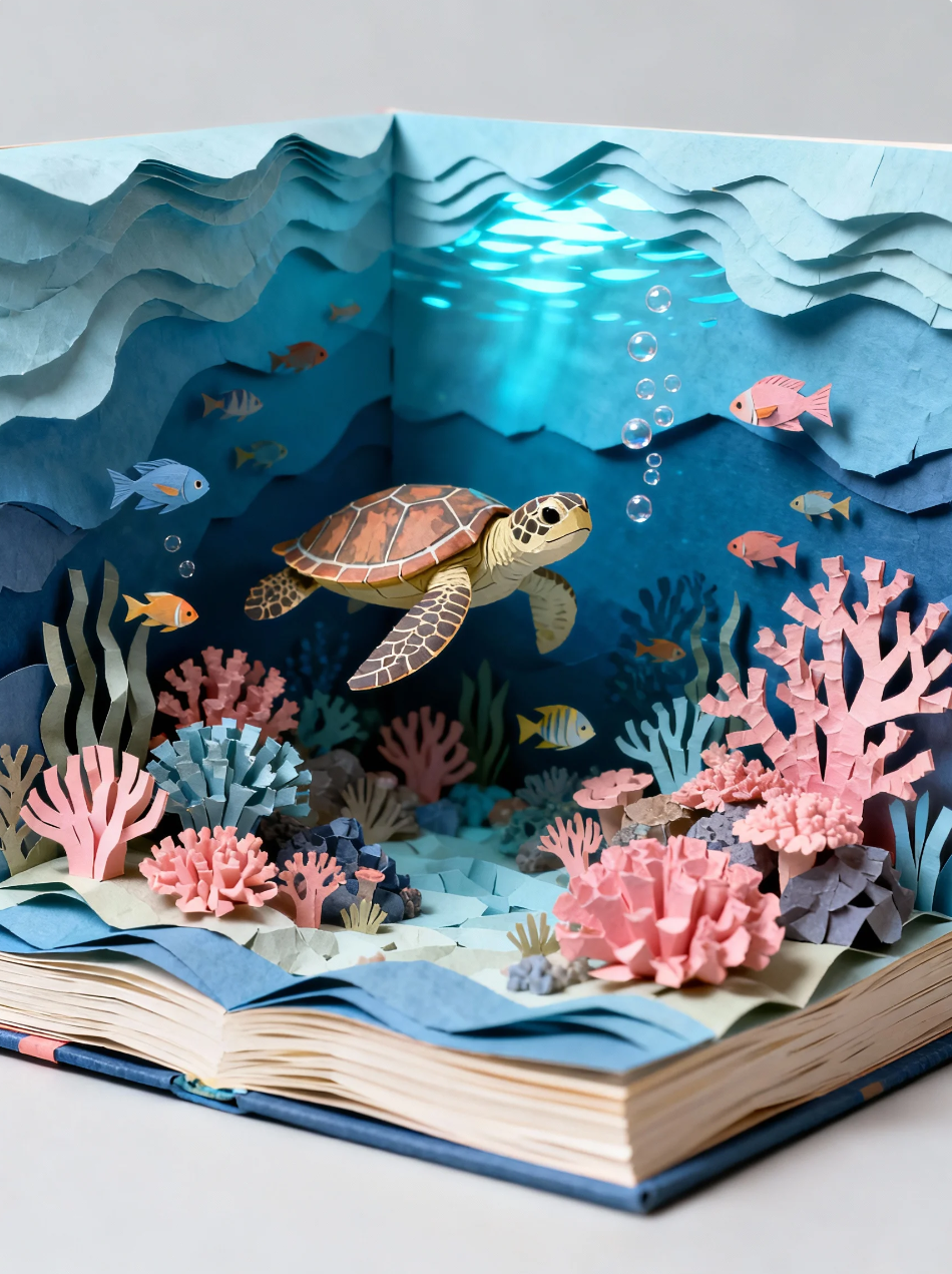 - 优化提示:“一幅以[深海探秘]为主题的3D立体书插画,层叠的纸质元素展开成一个微缩珊瑚礁场景,海龟和鱼群层层游弋。柔和的蓝光渗透,纹理丰富的纸张表面模拟手工波浪的趣味质感,柔和的[海蓝]和[珊瑚粉]色调,从略微倾斜的角度观看,突出水下层次感和气泡细节,高清适配海洋科普图书印刷。”