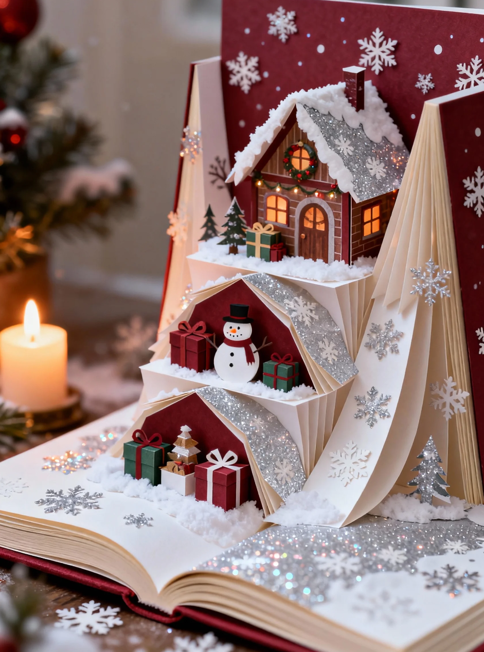 - 优化提示:“一幅以[圣诞惊喜]为主题的3D立体书插画,层叠的纸质元素展开成一个微缩雪屋场景,礼物和雪人层层堆叠。柔和的烛光辉映,纹理丰富的纸张表面充满手工雪花的趣味质感,柔和的[银白]和[深红]色调,从略微倾斜的角度观看,展现出节日层次感和闪光细节,温暖氛围适合家庭节日故事书。”