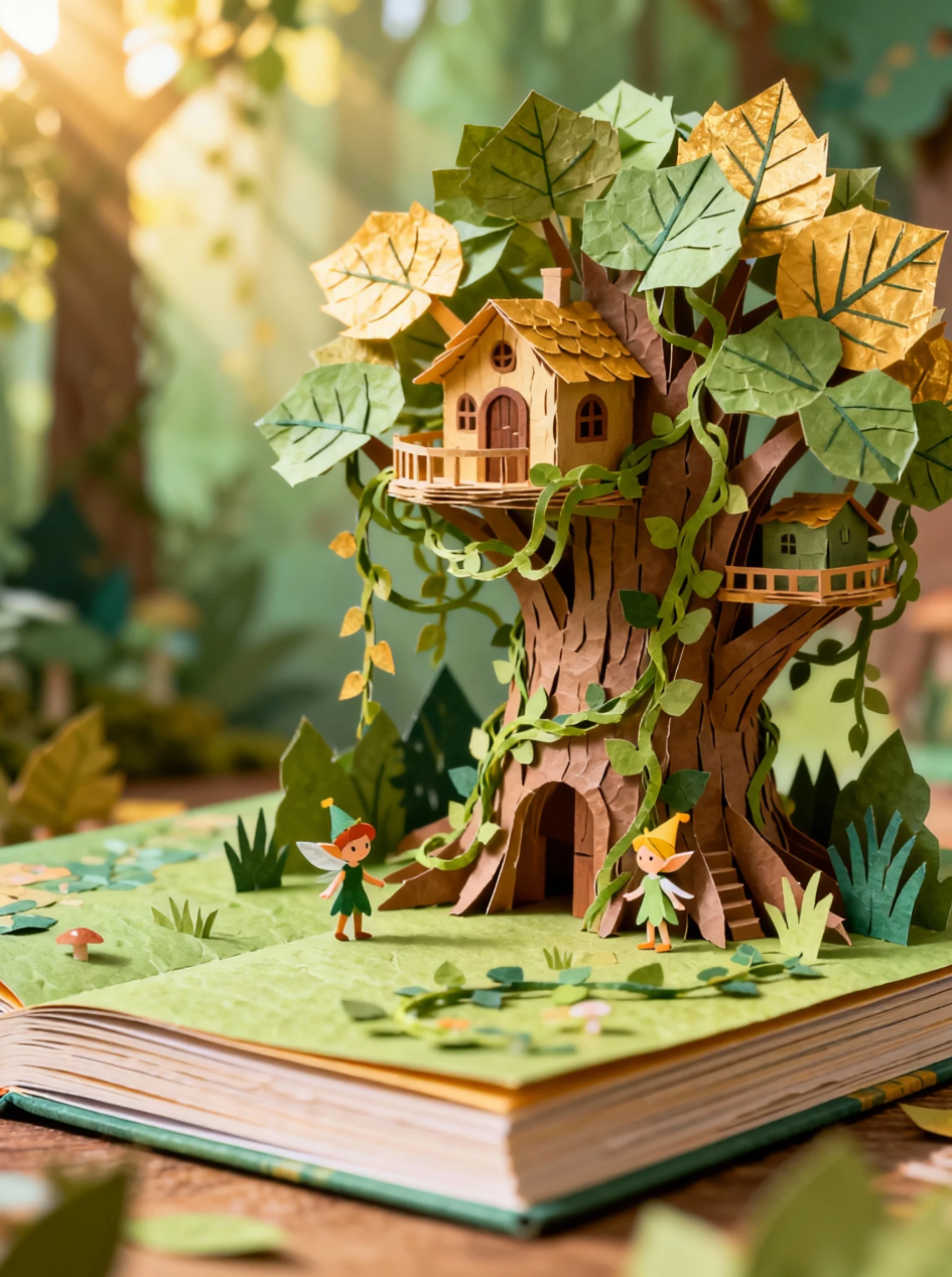 - 优化提示:“一幅以[魔法森林]为主题的3D立体书插画,层叠的纸质元素展开成一个微缩树屋场景,藤蔓和小精灵层层交织。柔和的阳光过滤,纹理丰富的纸张表面充满手工雕琢的趣味质感,柔和的[翠绿]和[金黄]色调,从略微倾斜的角度观看,展现出生动层次感和叶脉细节,适合5-8岁儿童环保故事书。”