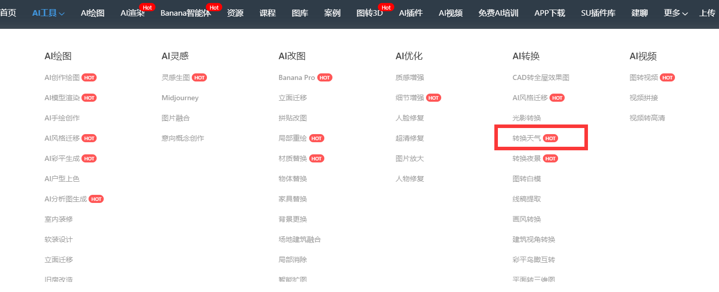 2. 登录后看首页导航栏,点击【AI工具】,再选下拉菜单里的【AI天气季节转换工具】,进入操作界面。