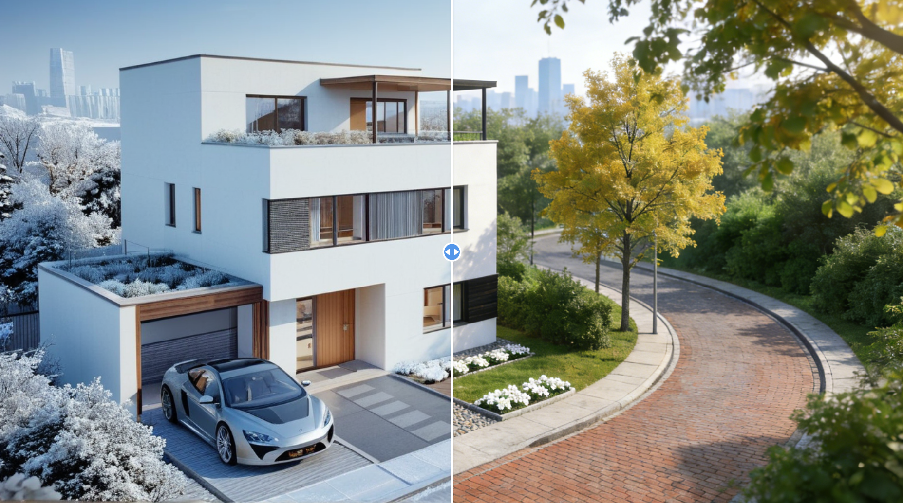 做房产建筑设计的宝子们都懂吧!方案评审时,甲方必问“这房子四季住着都舒服吗?采光通风行不行?” 这时候,能拿出建筑在春夏秋冬不同天气下的效果图,说服力直接翻倍!