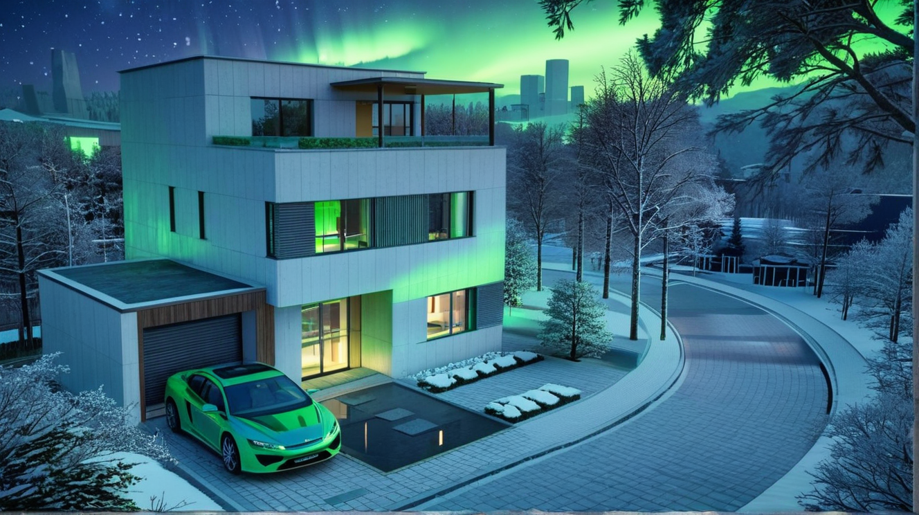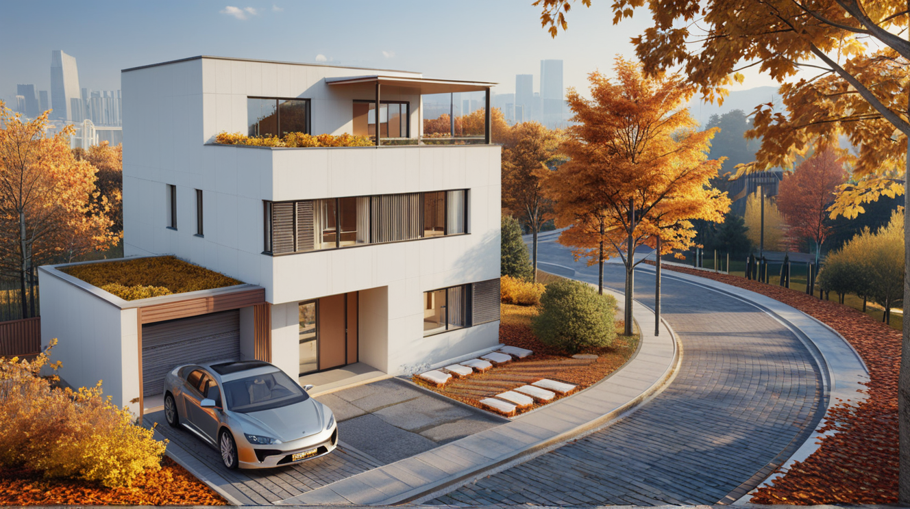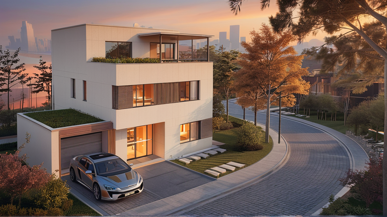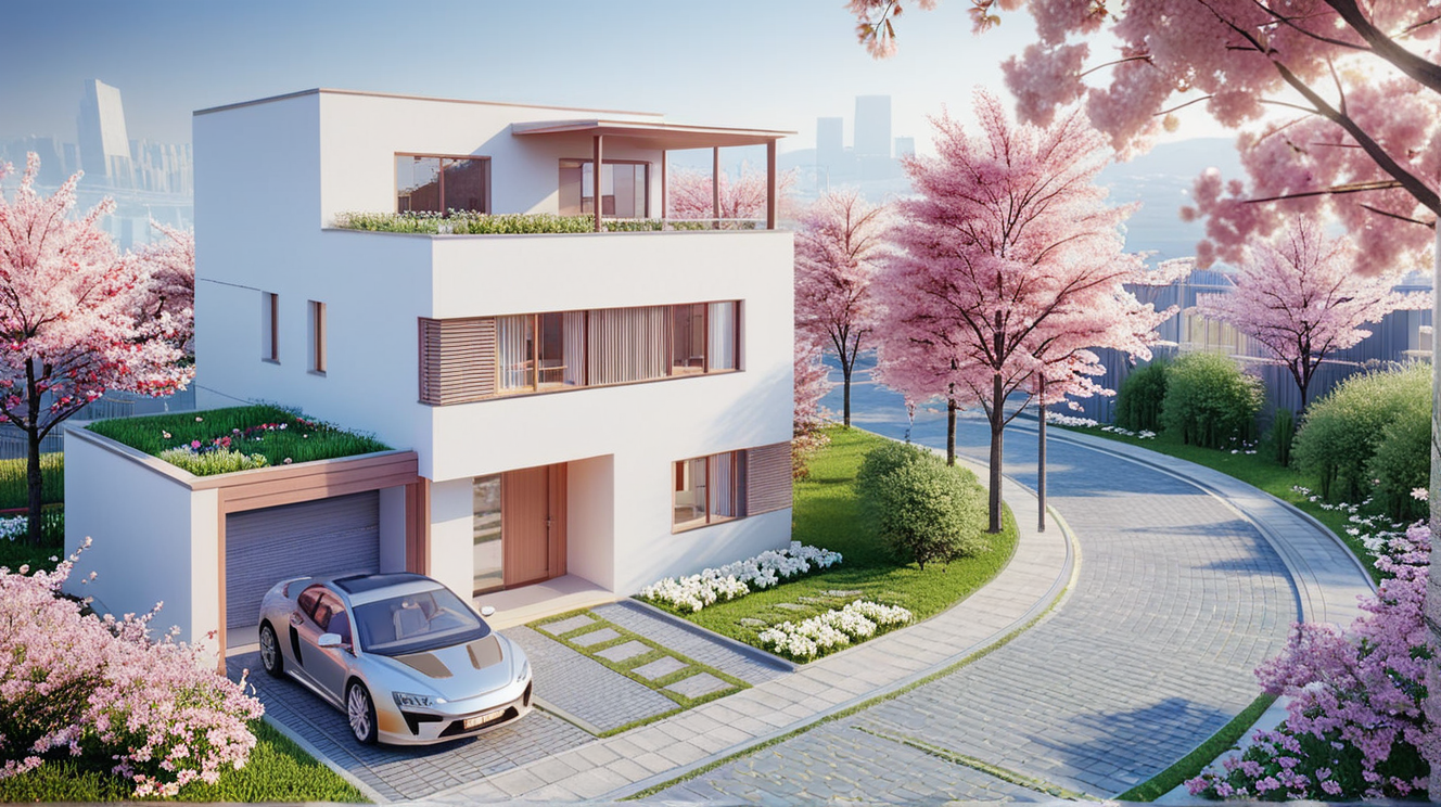 指令: 3层北欧别墅建筑效果图,要求有院子,门口停一辆跑车,门口有道路,道路上有行道树,有灌木丛,远处有若影若现的城市建筑,画面要有真实感 |