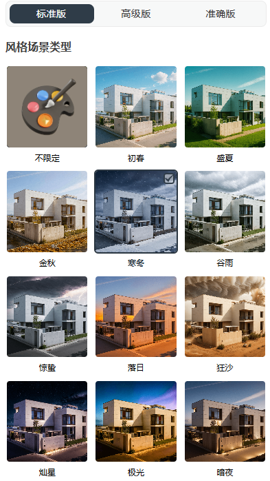 还可以对建筑场景进行进一步描述,同时提供【高-中-低-最低】的图片转换程度 。