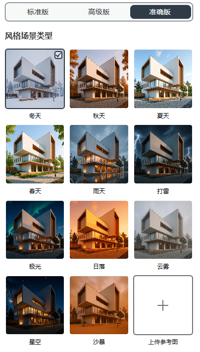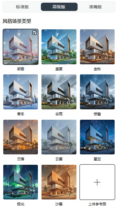 好的AI图像工具,内置了海量建筑专属的季节元素库,能精准识别设计图细节,转换时完全不破坏核心结构。