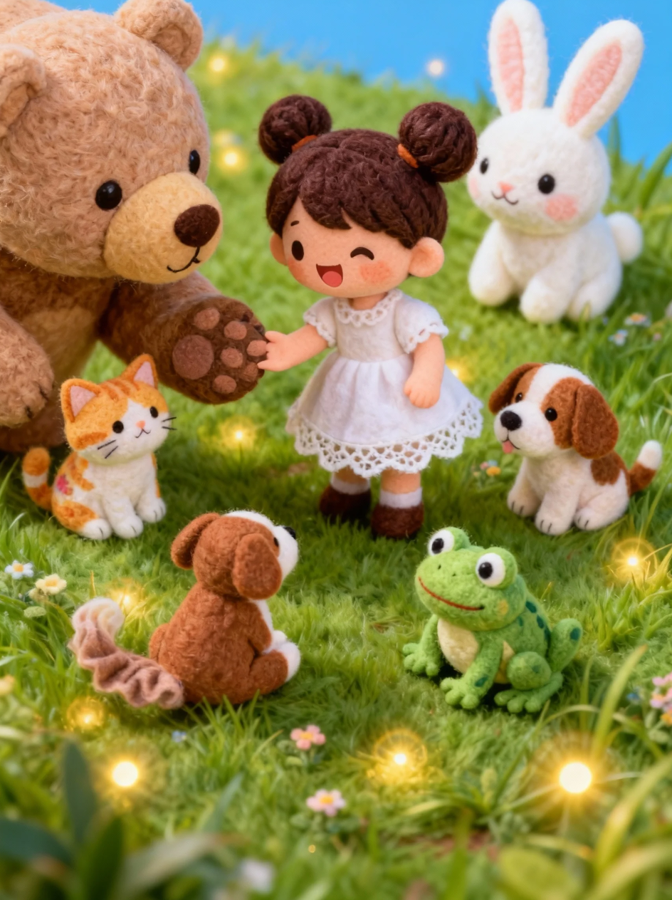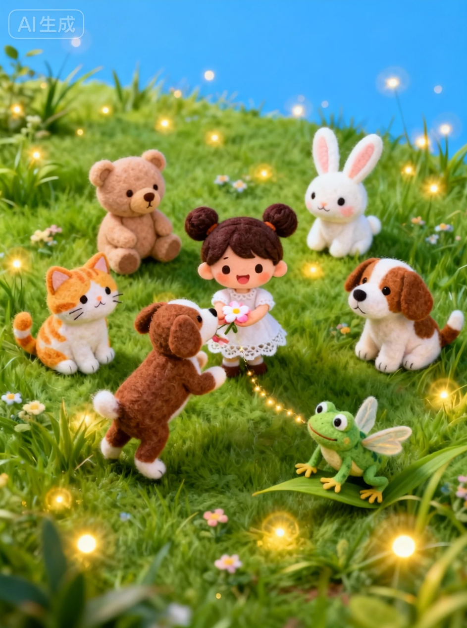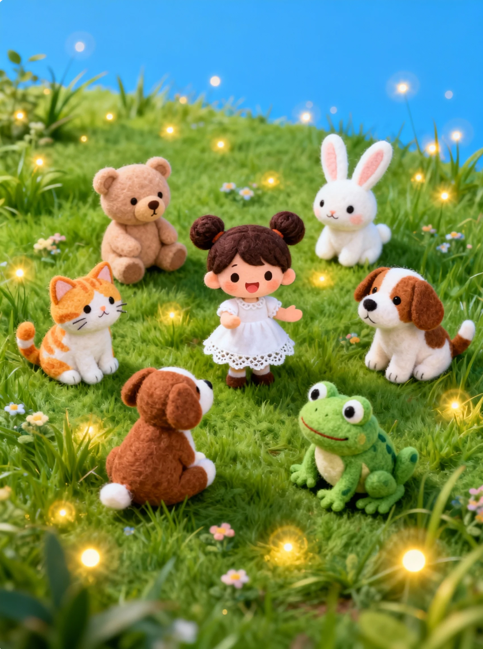镜头 1:俯视全景,毛毡质感的绿草地铺展在澄澈蓝天下,扎双马尾的白裙小女孩刚踏上草地,棕熊、白兔、花狗等毛绒动物们从草叶间探出头,零星萤火虫光点像细碎的暖黄糖粒浮在空气里。