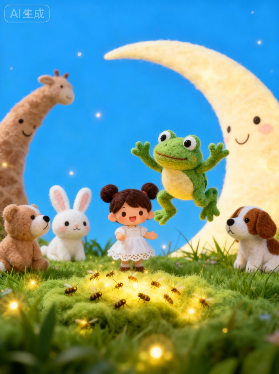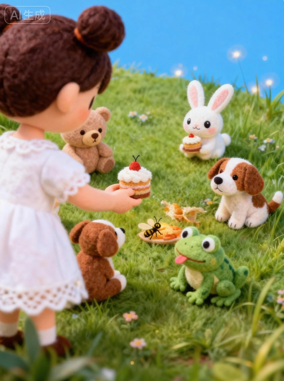 镜头 5:平视中景,小女孩掏出迷你毛毡小蛋糕分给动物们 —— 白兔捧蛋糕眨圆眼,青蛙蹲旁吐软舌,萤火虫在食物上方飞行。