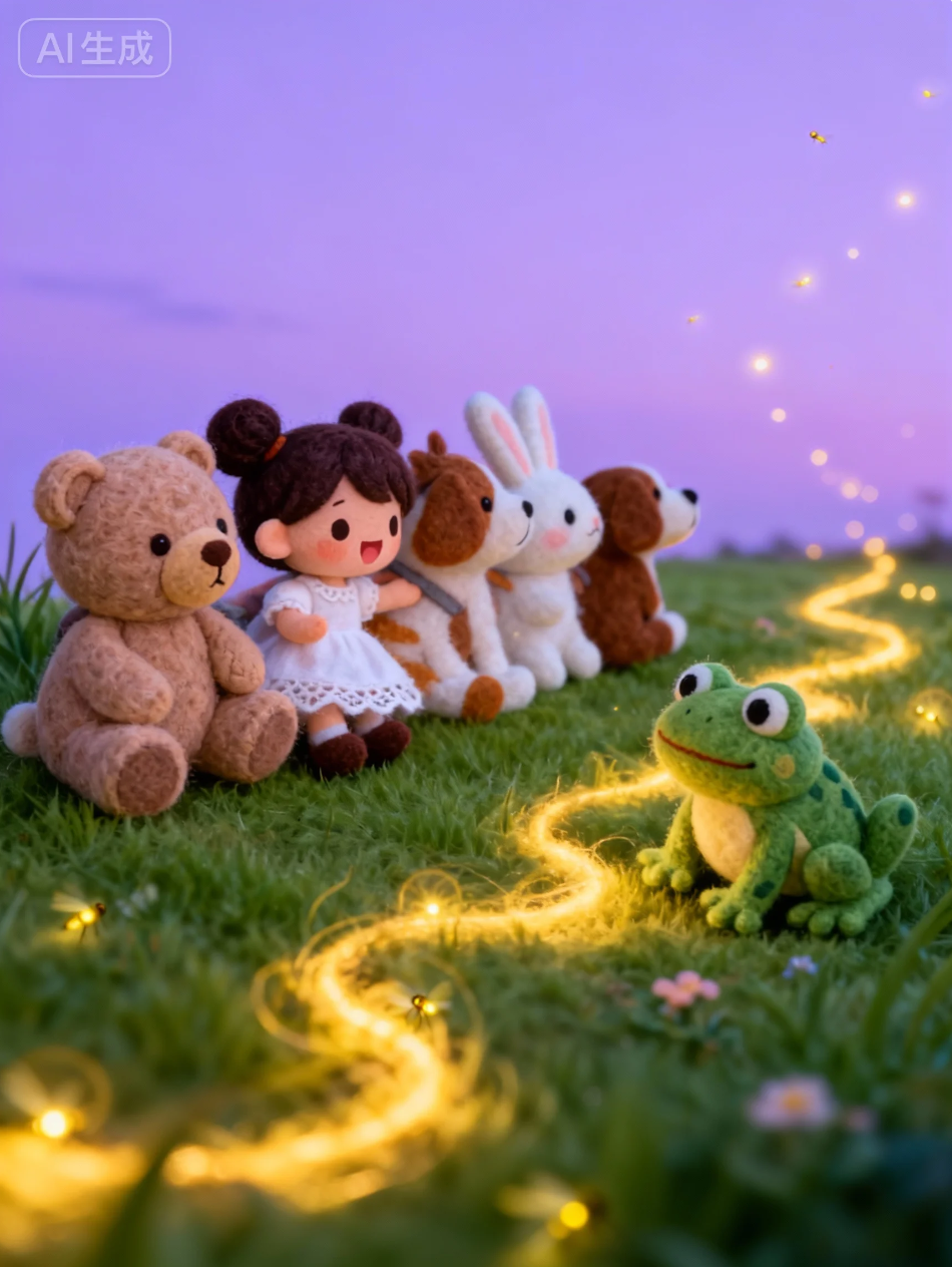 镜头7:平视全景,毛毡夜空晕开淡紫底色,整片草地的萤火虫连成暖黄光带,小女孩和动物们肩挨肩坐成排,脑袋凑在一起看光点飘向远方,脚边的毛毡小花轻轻晃。