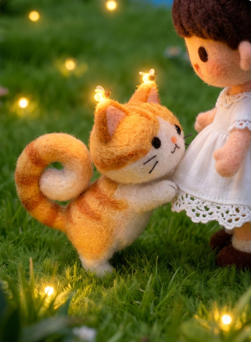 镜头 3:平视特写,橘白毛毡小猫踮肉垫蹭小女孩的裙摆,尾巴卷成蓬松的圈,两只萤火虫落在猫耳尖,暖光把绒毛染成温柔的橘黄。