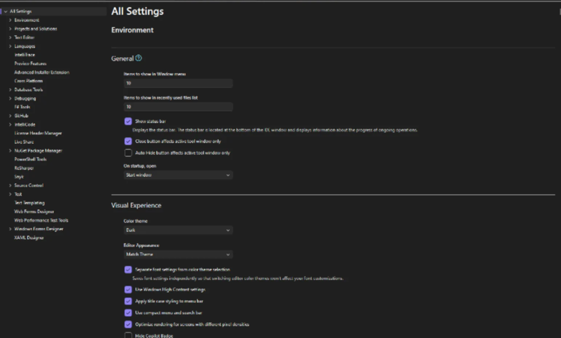 在过去的vs中,寻找配置一直以来都有点像“寻宝游戏”——功能强大,但却不容易找到。而在 Visual Studio 2026 中,微软终于给了我们一张清晰的“地图”。全新的设置界面更加简洁、灵活,甚至还能与你的代码仓库同步,让你的开发环境随时随地跟随你。